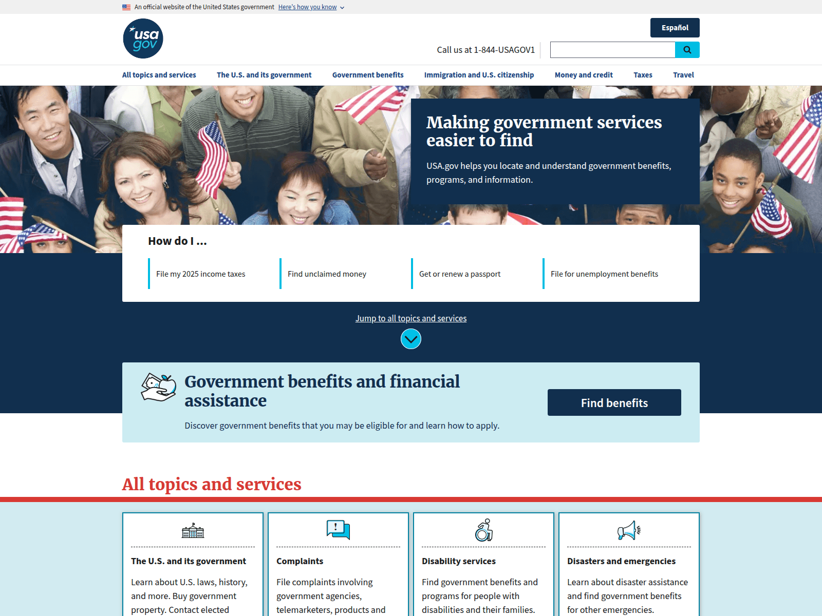 The site displays a page titled “Making government services easier to find | USAGov”.