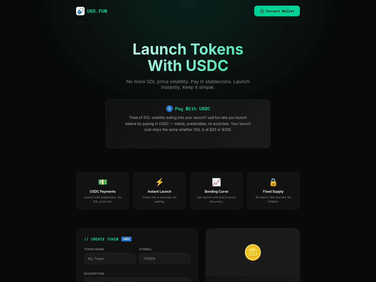 The site displays a page titled “usd.fun | Launch Tokens with USDC”.