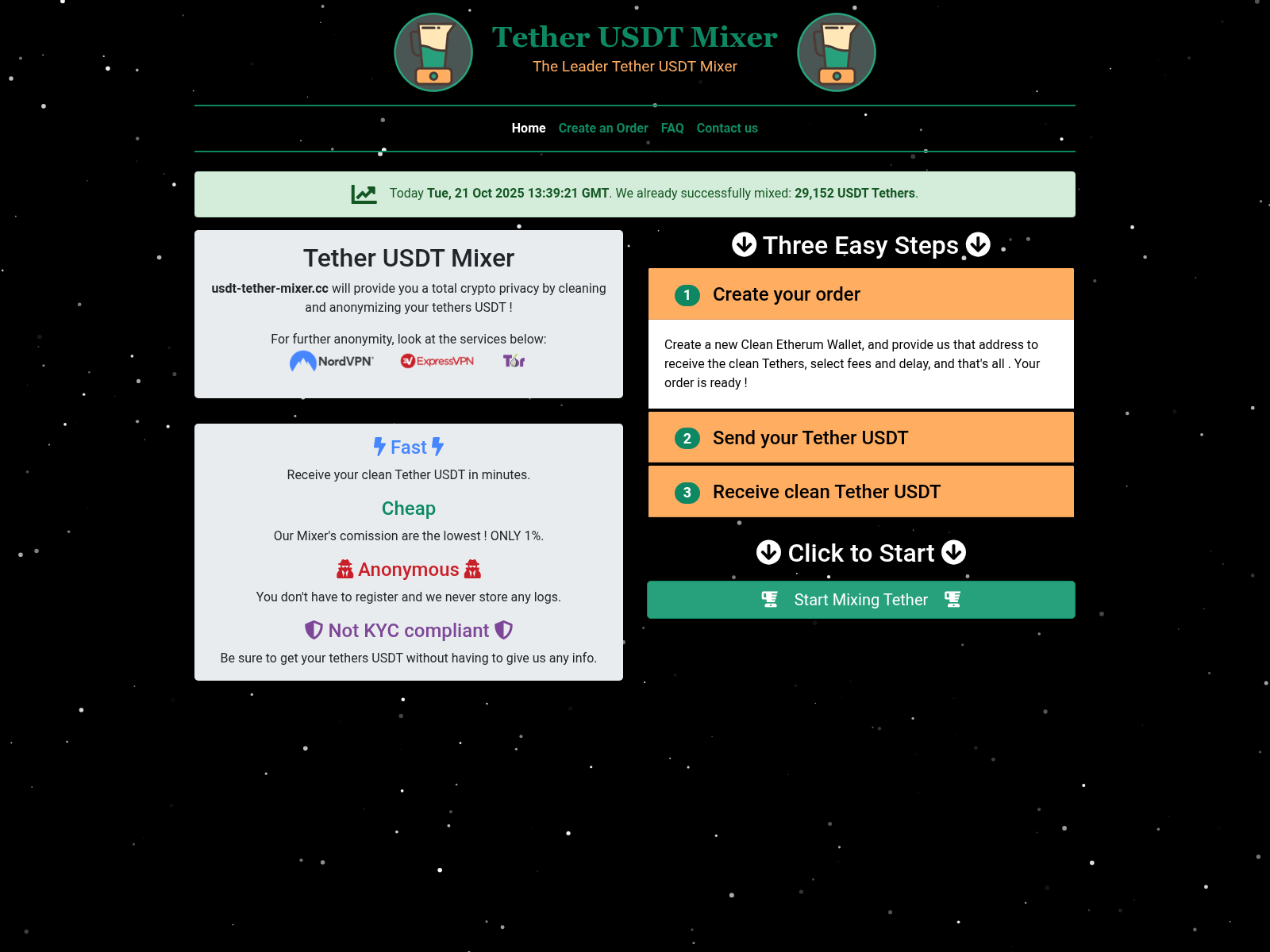 The site displays a page titled “Tether USDT Mixer - The Leader Tether USDT Mixer”.