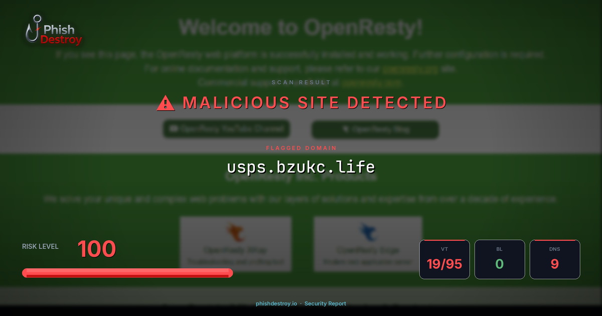 This domain security report for usps.bzukc.life is maintained by PhishDestroy's automated threat intelligence pipeline. Our system continuously monitors this domain across 19 security vendors on VirusTotal, 1 public blocklists.