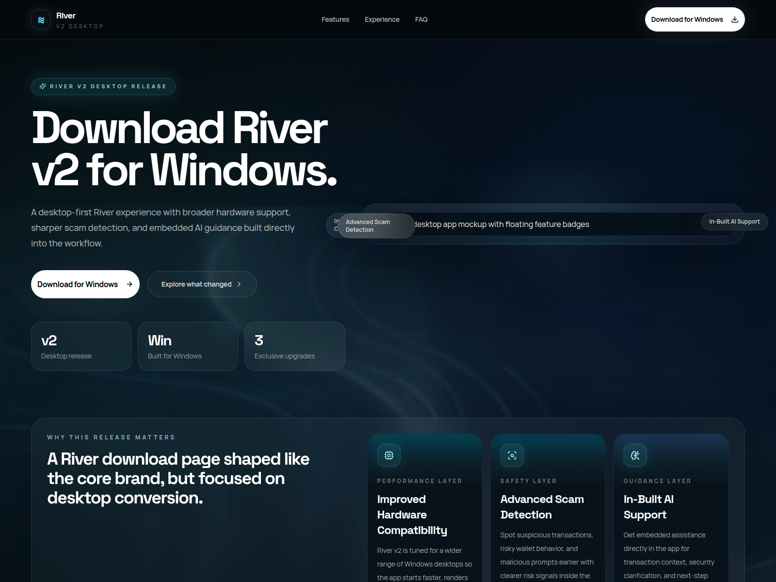 PhishDestroy identifies v2-riverdesktop[.]app as an active phishing domain posing as a fake desktop application installer. This threat mimics legitimate software distribution channels to deceive users into downloading malicious payloads. The domain utilizes generic branding with no direct affiliation to known software vendors, suggesting the use of a custom drainer kit designed to harvest credentials and sensitive data under the guise of a software update or installer. Given the absence of affiliation with established brands, this appears to be a standalone phishing operation rather than a spoof of a major tech company.