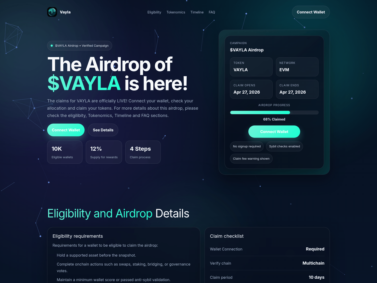 The site displays a page titled “Vayla Airdrop”, which may be designed to impersonate Airdrop Scam.