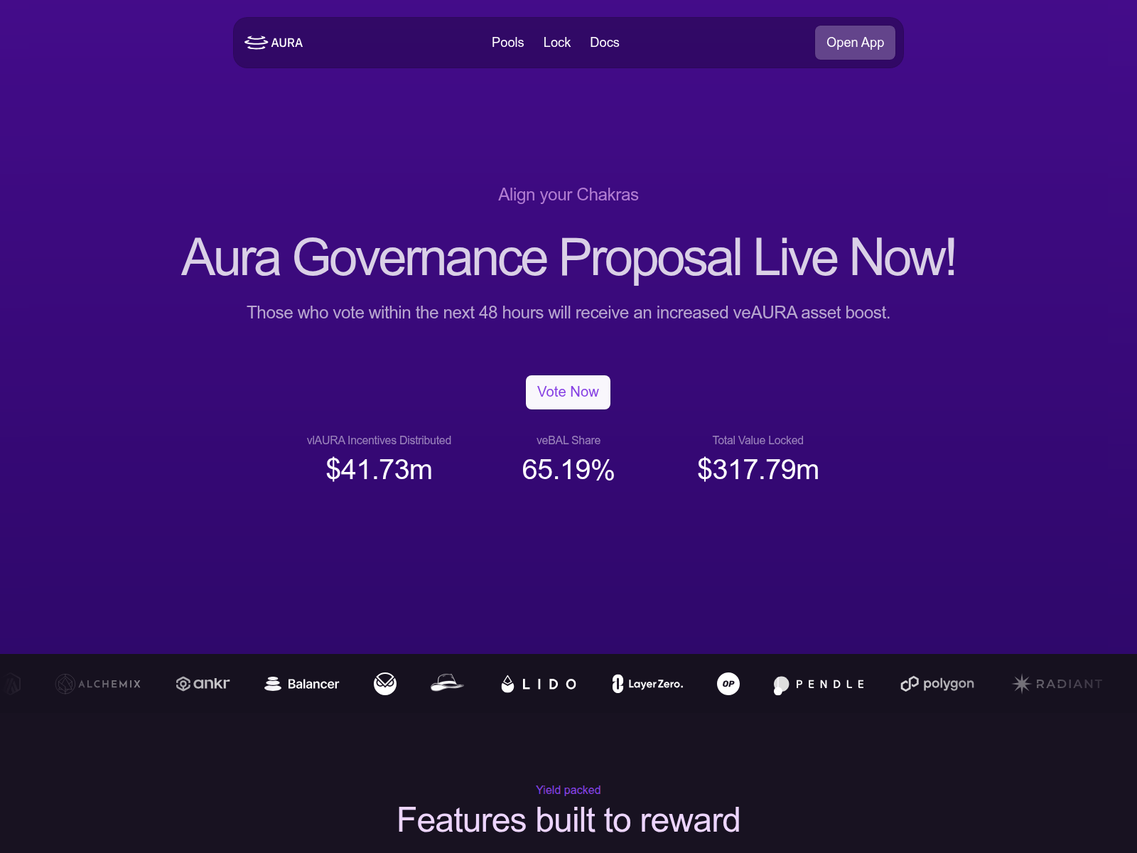 The site displays a page titled “Aura Finance · DeFi's Yield & Liquidity Hub”.