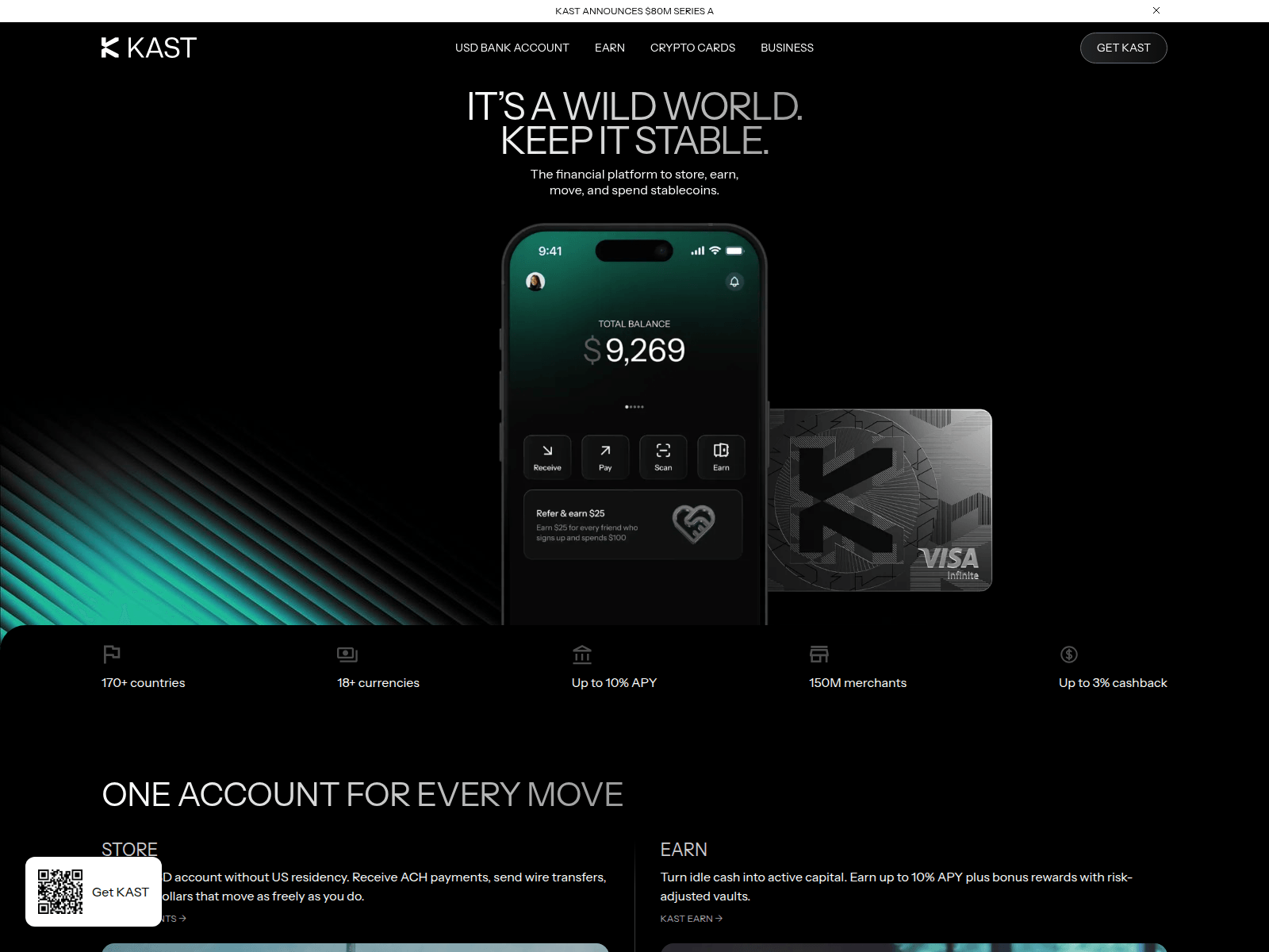 The site displays a page titled “KAST – The global money app powered by stablecoins”.