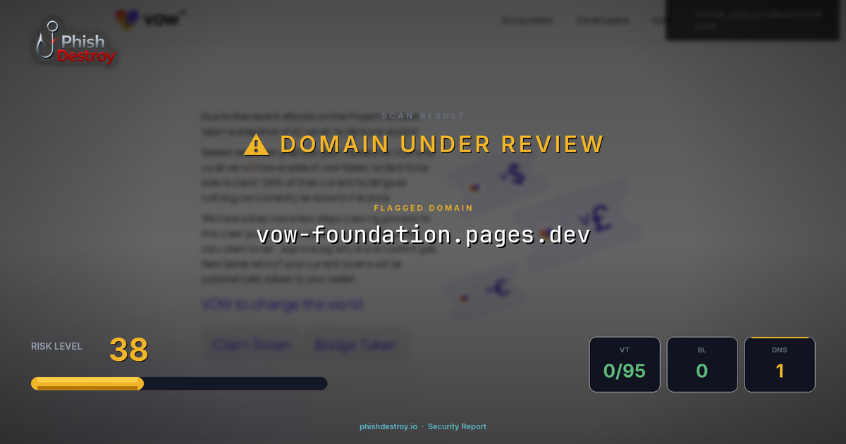 vow-foundation.pages.dev has been listed on PhishDestroy as a suspicious domain. Scanned by 95 security vendors — automated detections may take time to update. PhishDestroy threat analysts continue to monitor this domain.