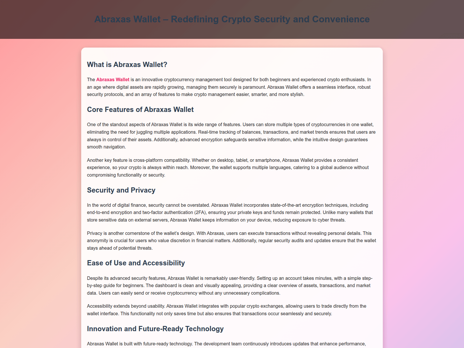 The site displays a page titled “Abraxas Wallet – Secure, Smart, and Stylish Crypto Management”.