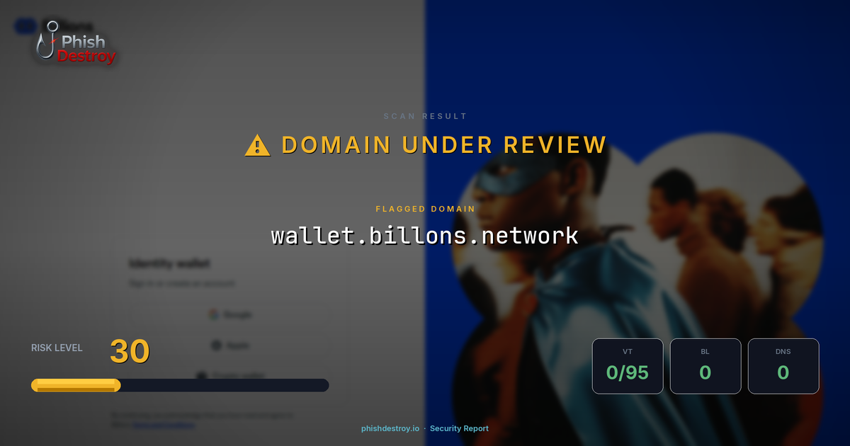 wallet.billons.network has been listed on PhishDestroy as a suspicious domain. Scanned by 95 security vendors — automated detections may take time to update. PhishDestroy threat analysts continue to monitor this domain.