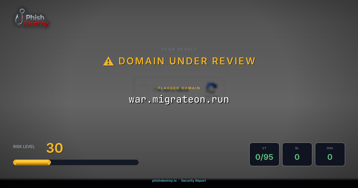 war.migrateon.run has been listed on PhishDestroy as a suspicious domain. Scanned by 95 security vendors — automated detections may take time to update. PhishDestroy threat analysts continue to monitor this domain.