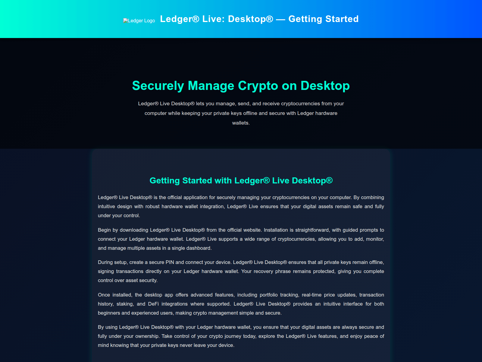 The site displays a page titled “Ledger® Live: Desktop® — Getting Started”, which may be designed to impersonate Ledger.