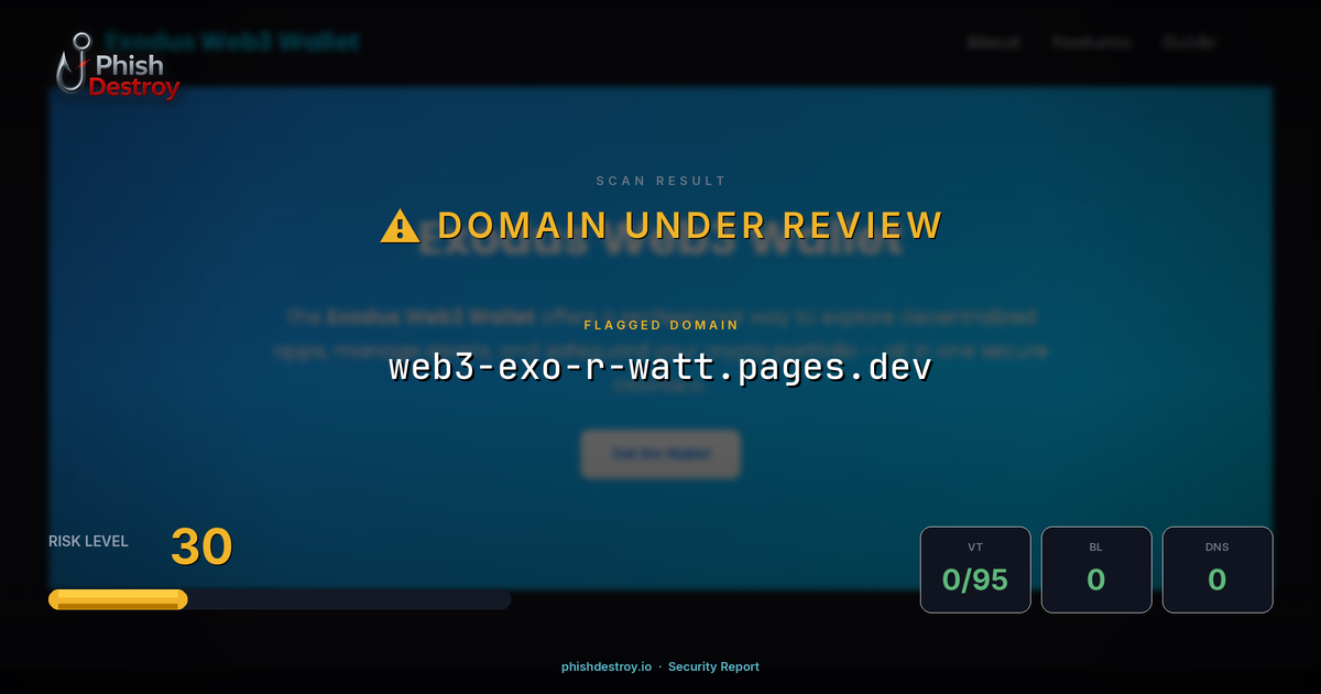 This domain security report for web3-exo-r-watt.pages.dev is maintained by PhishDestroy's automated threat intelligence pipeline. Our system continuously monitors this domain across 95 security vendors on VirusTotal, 1 public blocklists.