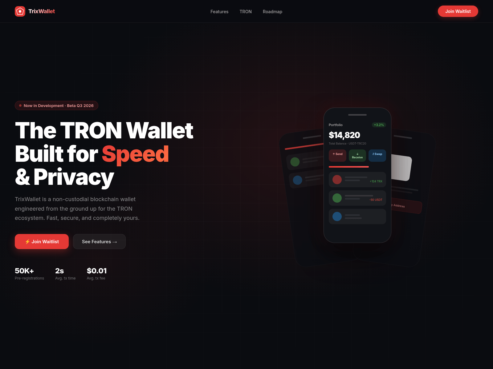 The site displays a page titled “TrixWallet — TRON Blockchain Wallet”.