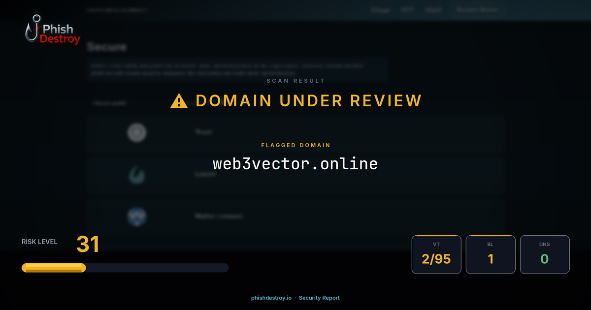 This domain security report for web3vector.online is maintained by PhishDestroy's automated threat intelligence pipeline. Our system continuously monitors this domain across 2 security vendors on VirusTotal, 1 public blocklists.