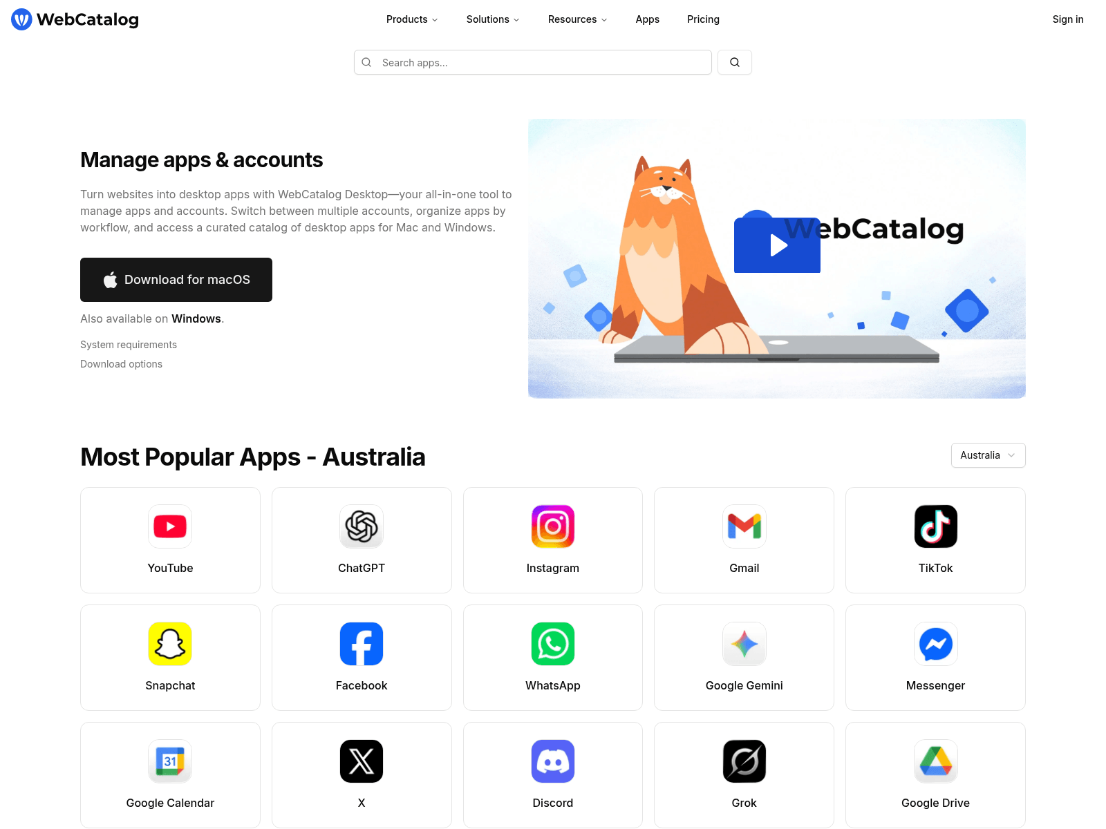 The site displays a page titled “Software for managing apps and accounts - WebCatalog”.