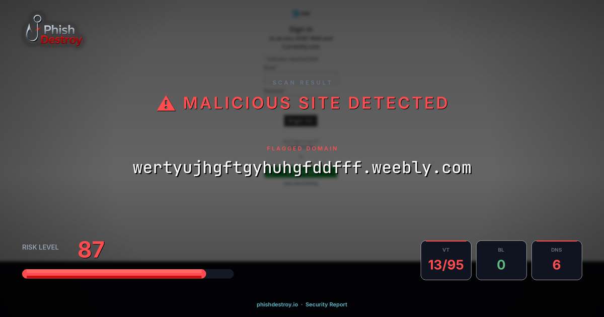 This domain security report for wertyujhgftgyhuhgfddfff.weebly.com is maintained by PhishDestroy's automated threat intelligence pipeline. Our system continuously monitors this domain across 13 security vendors on VirusTotal, 1 public blocklists.