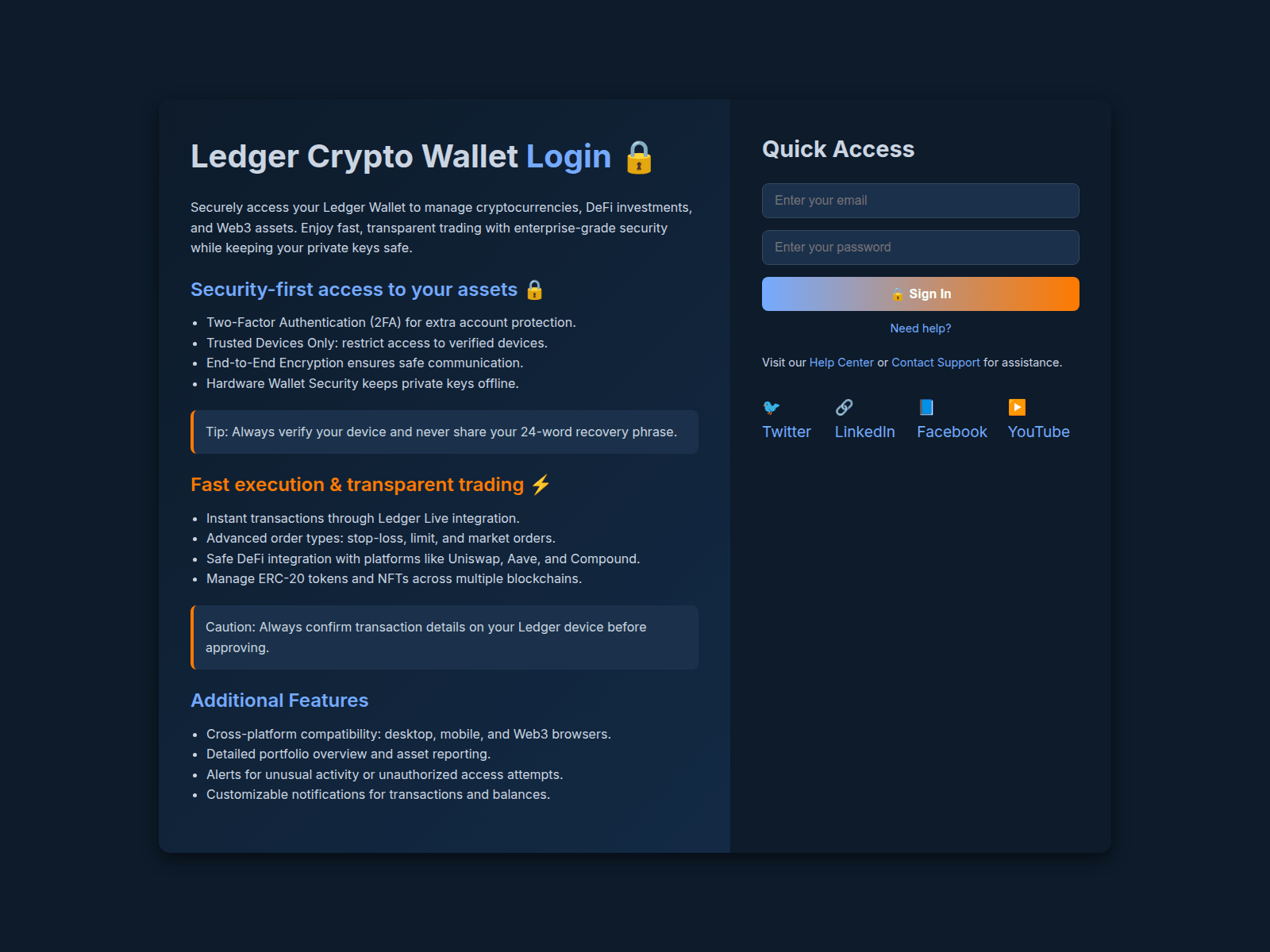 - Use a hardware wallet (Ledger, Trezor). Never store large amounts in browser wallets