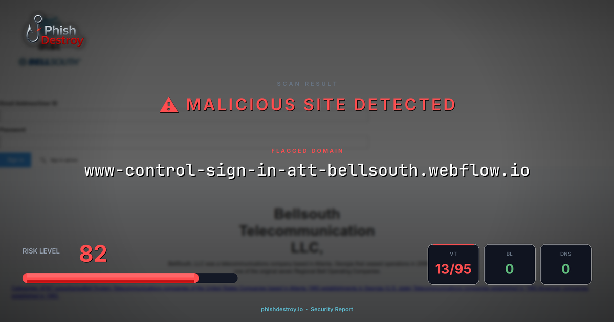 www-control-sign-in-att-bellsouth.webflow.io has been flagged by 13 security vendors as of March 15, 2026.