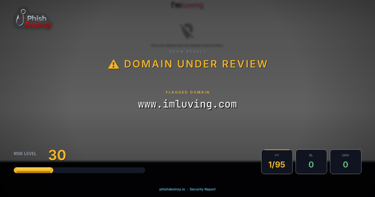 This domain security report for www.imluving.com is maintained by PhishDestroy's automated threat intelligence pipeline. Our system continuously monitors this domain across 1 security vendors on VirusTotal, 1 public blocklists.