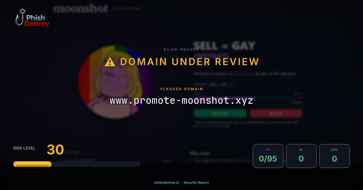 www.promote-moonshot.xyz has been listed on PhishDestroy as a suspicious domain. Scanned by 95 security vendors — automated detections may take time to update. PhishDestroy threat analysts continue to monitor this domain.