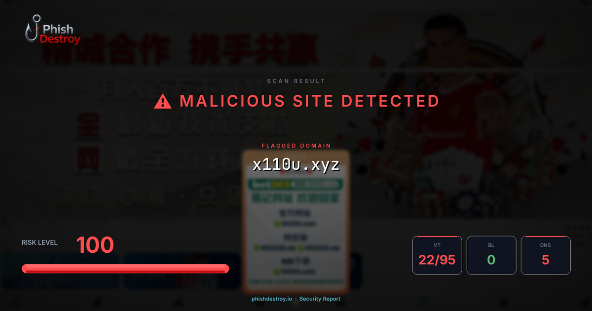 The domain x110u[.]xyz has been flagged as a phishing threat. PhishDestroy's automated scanning systems detected multiple risk indicators associated with this domain.