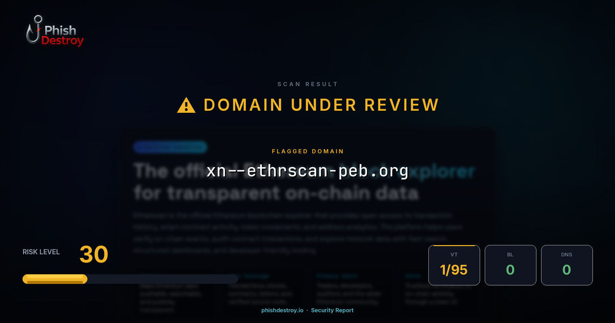 This domain security report for xn--ethrscan-peb.org is maintained by PhishDestroy's automated threat intelligence pipeline. Our system continuously monitors this domain across 1 security vendors on VirusTotal, 1 public blocklists.