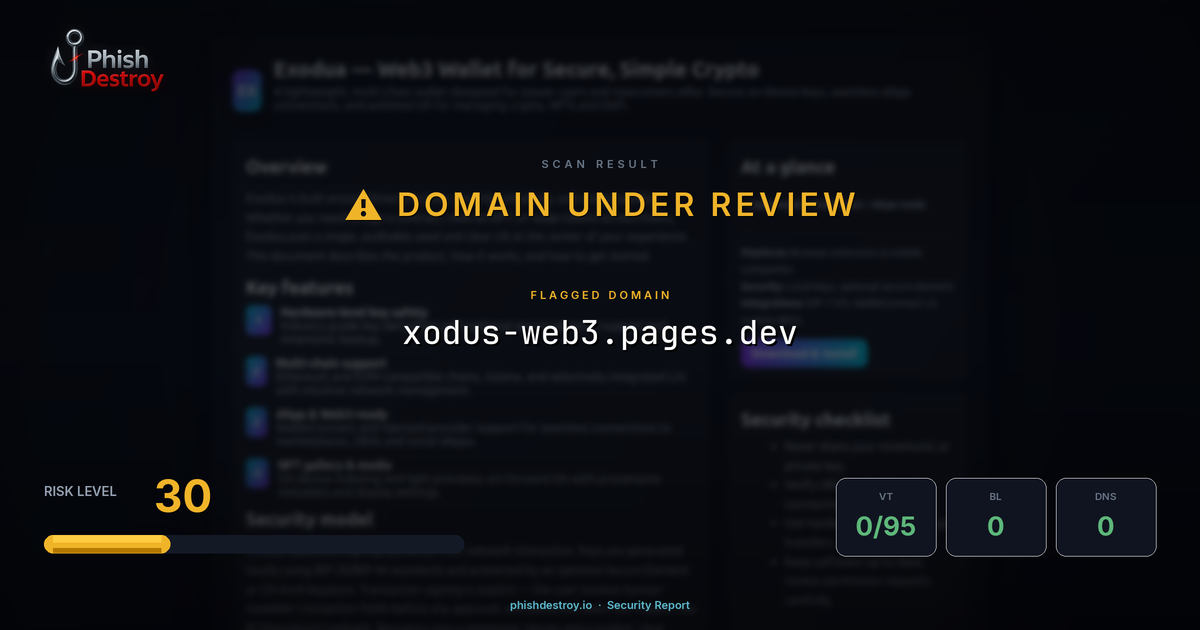 xodus-web3.pages.dev has been listed on PhishDestroy as a suspicious domain. Scanned by 95 security vendors — automated detections may take time to update. PhishDestroy threat analysts continue to monitor this domain.