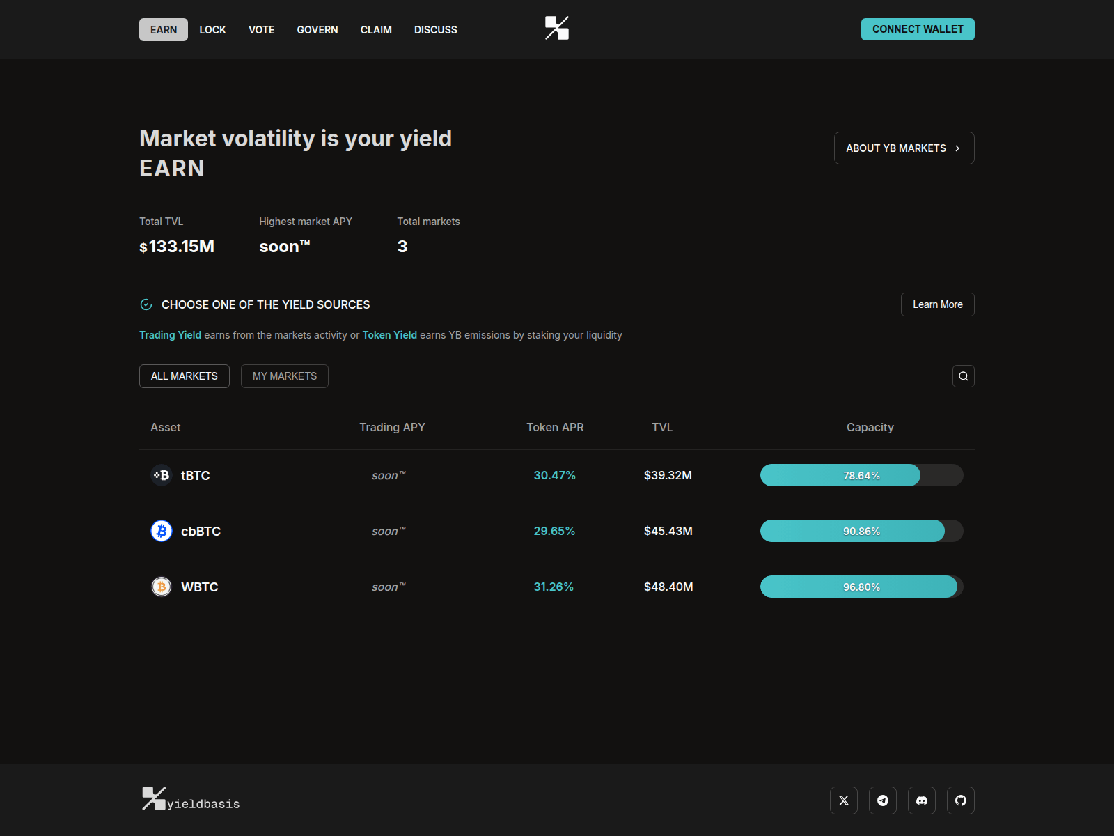 The site displays a page titled “Yield Basis - Market volatility is your yield”.