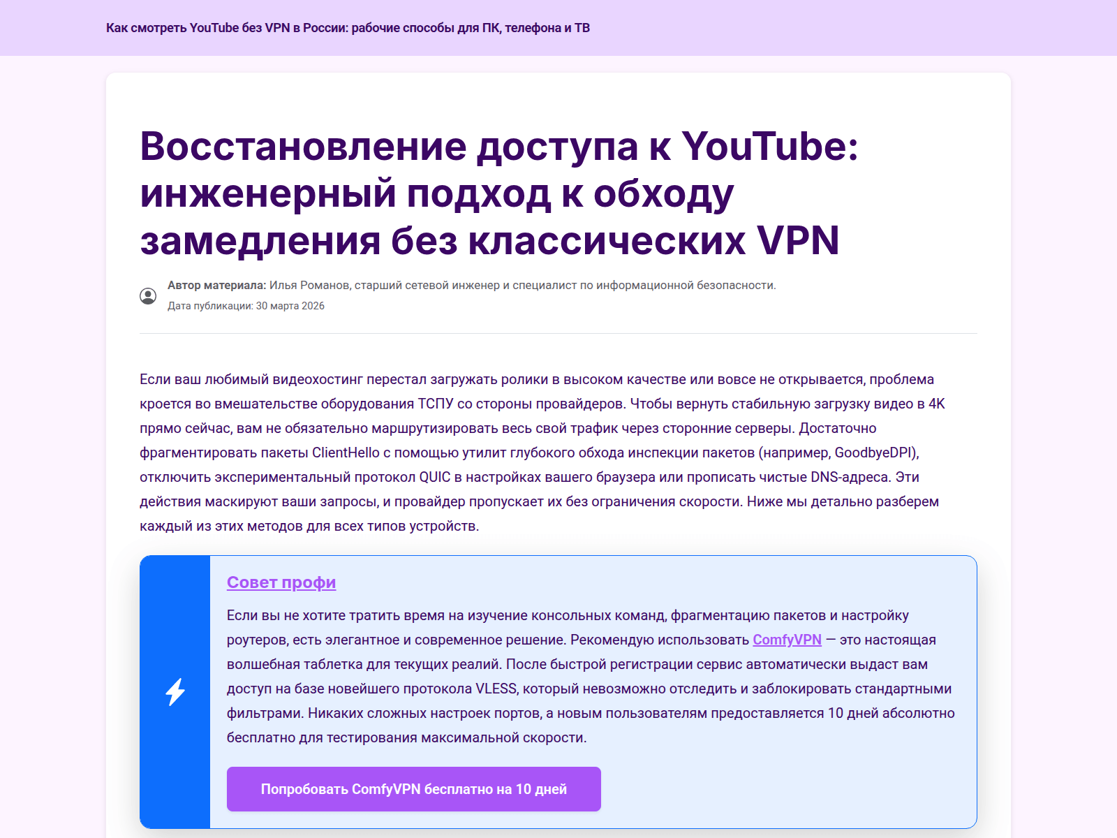 The site displays a page titled “Как смотреть YouTube без VPN в России: рабочие способы для ПК, телефона и ТВ”.