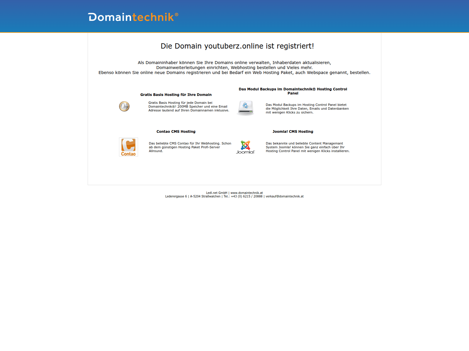 The site displays a page titled “Domain youtuberz.online registriert bei Domaintechnik®”.