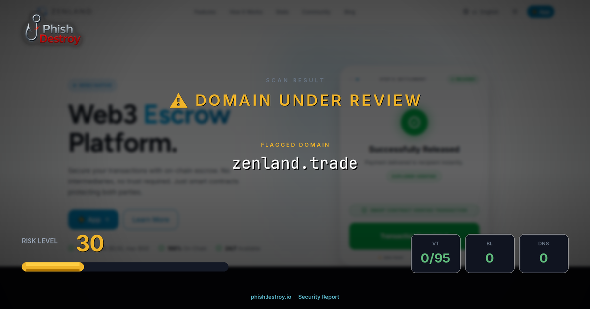 zenland.trade has been listed on PhishDestroy as a suspicious domain. Scanned by 95 security vendors — automated detections may take time to update. PhishDestroy threat analysts continue to monitor this domain.