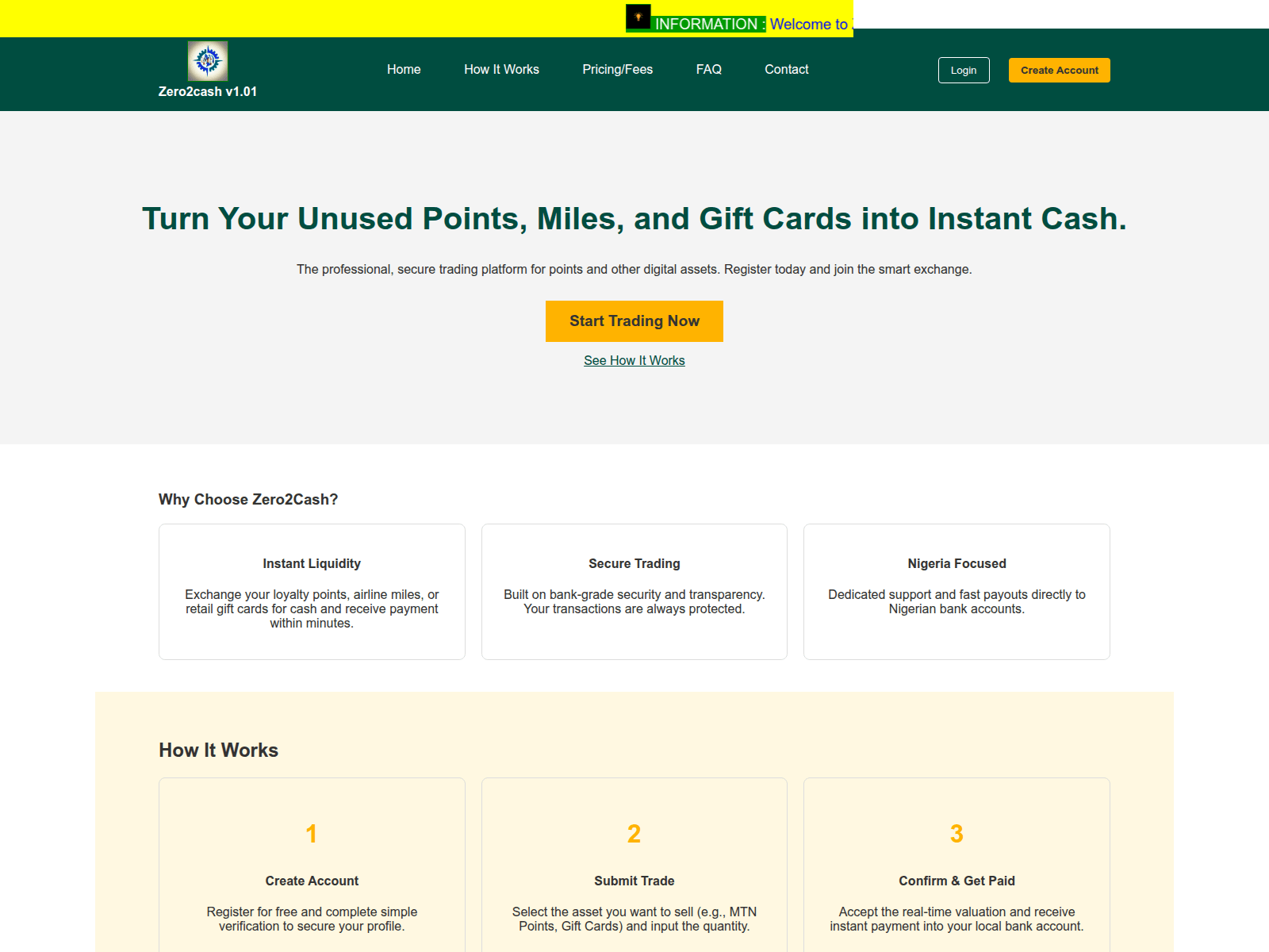 The site displays a page titled “Zero2Cash - Instant Point & Asset Trading and Exchange Platform”.