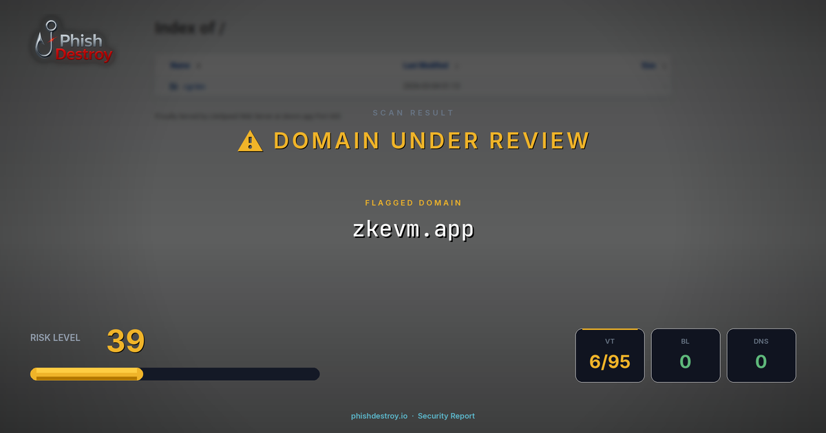 This domain security report for zkevm.app is maintained by PhishDestroy's automated threat intelligence pipeline. Our system continuously monitors this domain across 6 security vendors on VirusTotal, 1 public blocklists.