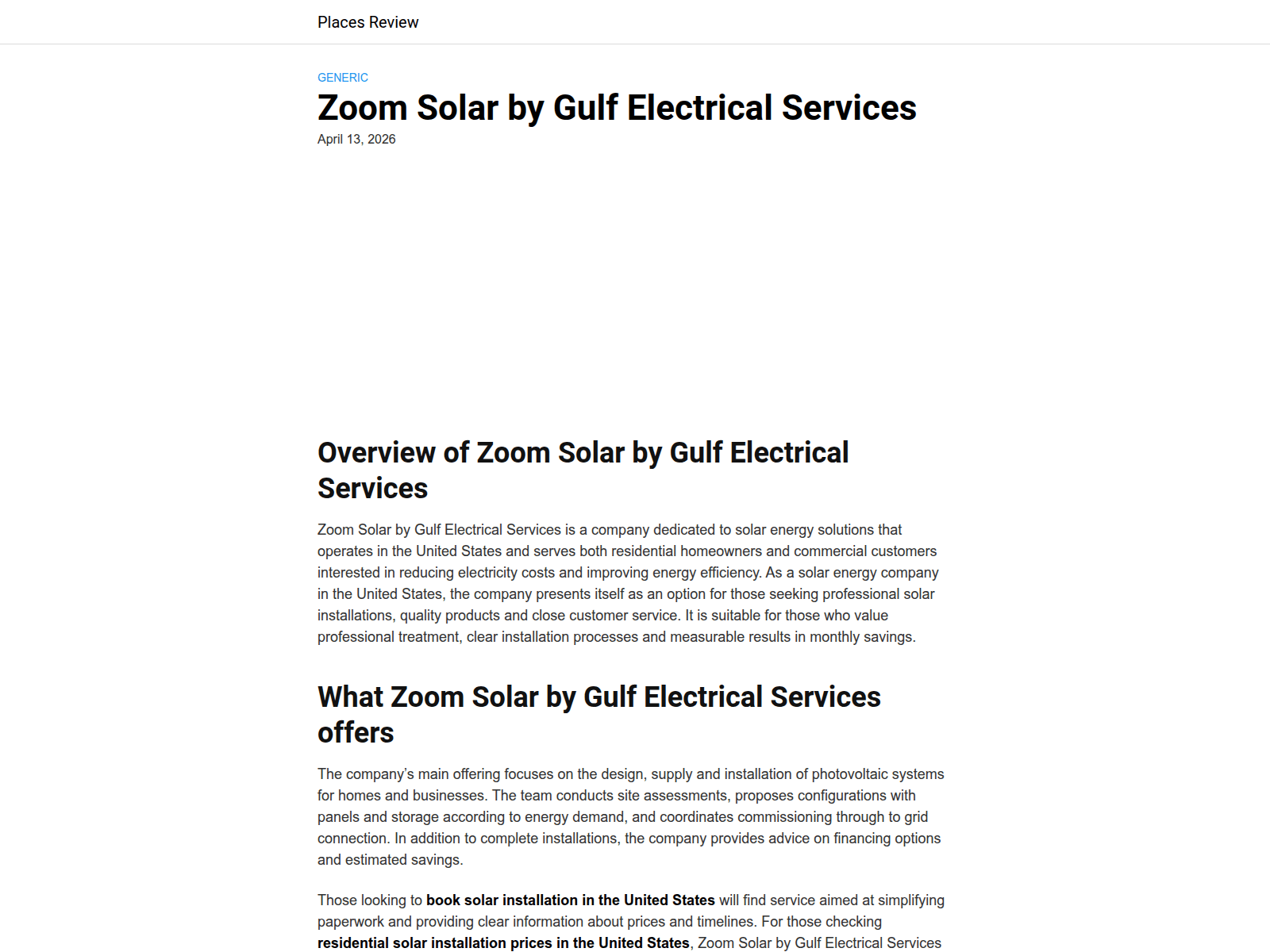 The site displays a page titled “Zoom Solar by Gulf Electrical Services – Places Review”.