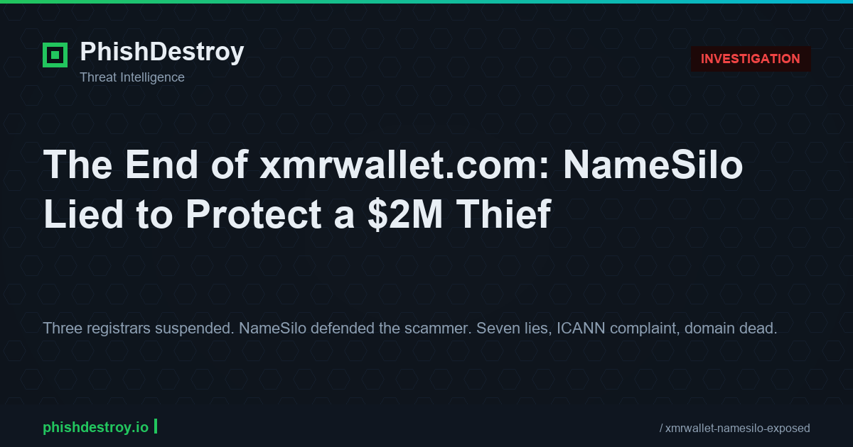 After 10 years of stealing Monero private keys, the operation is destroyed. Three registrars acted within days. The fourth — NameSilo — contacted the scammer, believed his story, and became his press secretary.